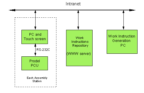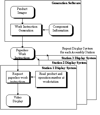 The work instructions system has two major components. The generation software allows an engineer to construct and change paperless work instructions. The Internet-based display system at each assembly station reads product and operation information from a pallet, retrieves the corresponding paperless work instructions, and displays them to the operator.