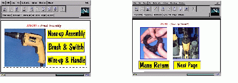 The engineer creates images of the product using a digital camera. After loading the image (in .dca format) and translating it to the .jpg format, the engineer (on the work instruction generation PC shown in Figure 4 ) uses a graphics editing tool to add lines and descriptive text to the image. Black & Decker chose Micrographx for this function. After saving the images, the engineer uses authoring software to add the images to work instruction templates, insert appropriate information, and save the work instructions as HTML files that can viewed using a standard World-Wide Web browser. As shown in Figure 4 , a network file server stores the work instructions repository. Black & Decker has chosen FrontPage and Microsoft Internet Explorer for these functions. The HTML files have hyperlinks that connect the multiple pages that form each operation's work instructions. The first page is an index page that displays the operation's result and the assembly sequence and has links to pages that explain and illustrate each step. An example of index page and the hyperlinked page of nose-up assembly of a product is shown below.